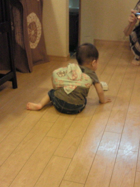 いざ、立たせてみると、まだ伝え歩きな息子には無理だったようで、一升餅に潰されながらハイハイ状態。