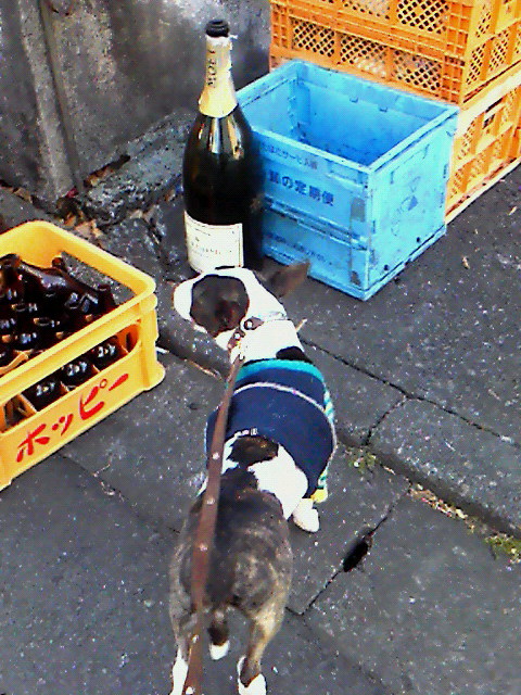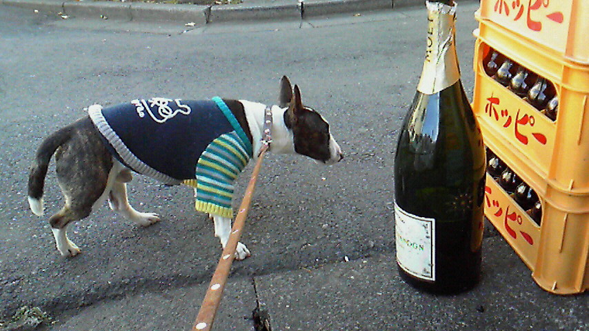 プースカとの朝のお散歩で見つけたでっかいシャンパンの瓶