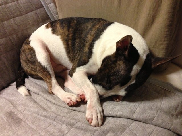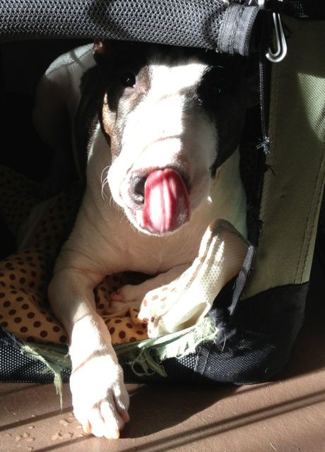 昨日のお散歩で、フライドチキンの骨が落ちてたもんで、パパの一瞬の隙を見てパクっとしたのさっ!