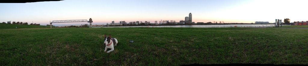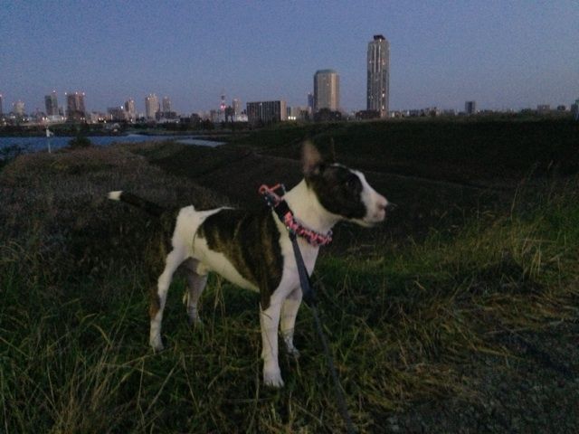 早朝は久しぶりに荒川の土手までプースカとお散歩。