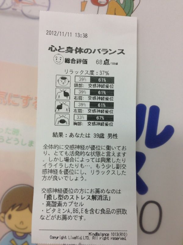 結果は、リラックス度37%とストレス溜まりまくりな感じでした。